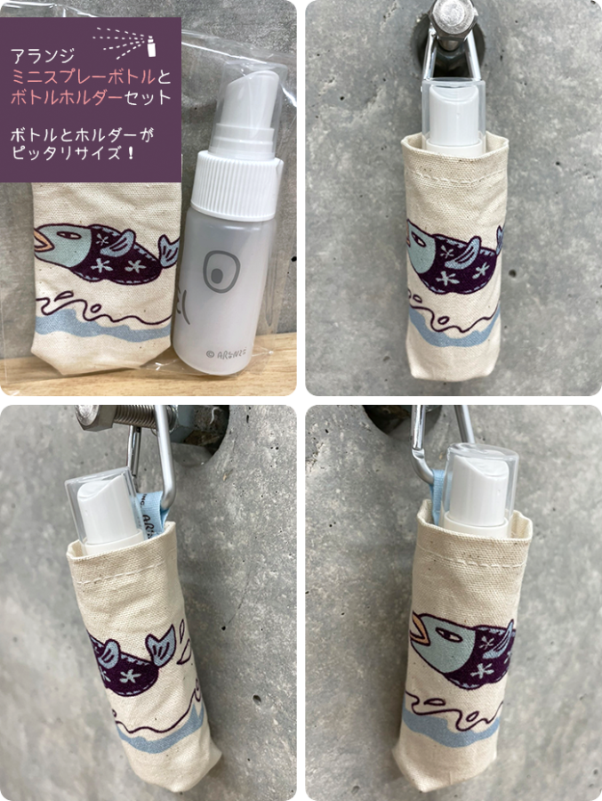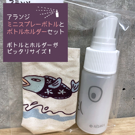 『アランジミニスプレーボトル ぷうちゃん』または『アランジミニスプレーボトル わるもの』とカラビナ付きの『スプレーボトルカバー』のセットです。