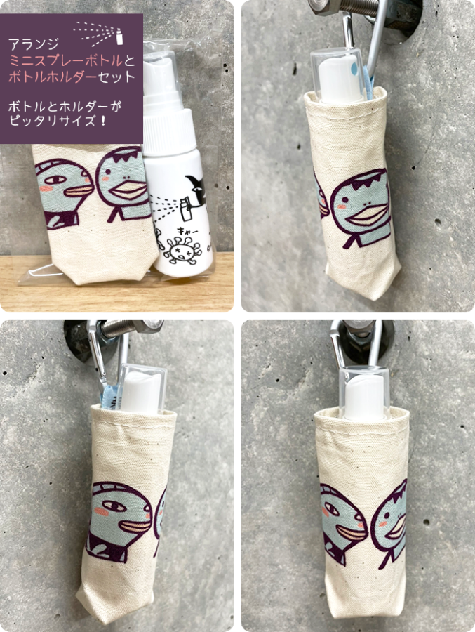 『アランジミニスプレーボトル ぷうちゃん』または『アランジミニスプレーボトル わるもの』とカラビナ付きの『スプレーボトルカバー』のセットです。