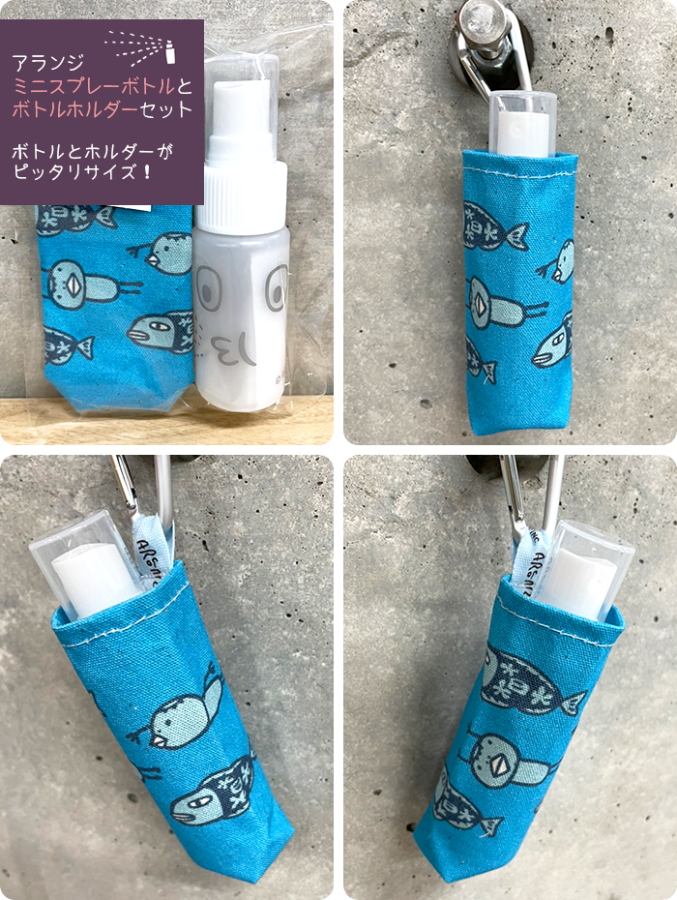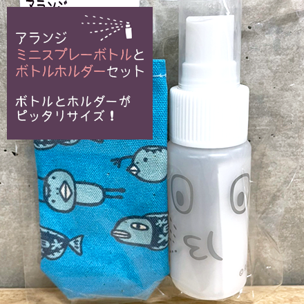 『アランジミニスプレーボトル ぷうちゃん』または『アランジミニスプレーボトル わるもの』とカラビナ付きの『スプレーボトルカバー』のセットです。