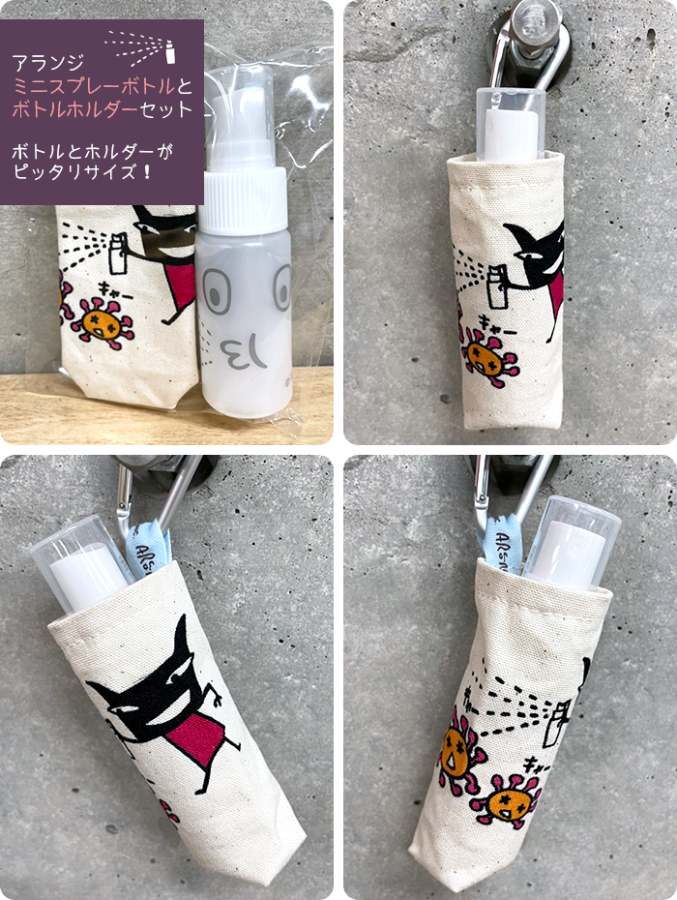 『アランジミニスプレーボトル ぷうちゃん』または『アランジミニスプレーボトル わるもの』とカラビナ付きの『スプレーボトルカバー』のセットです。