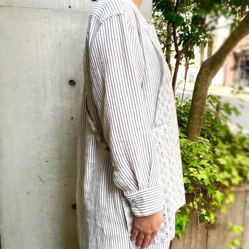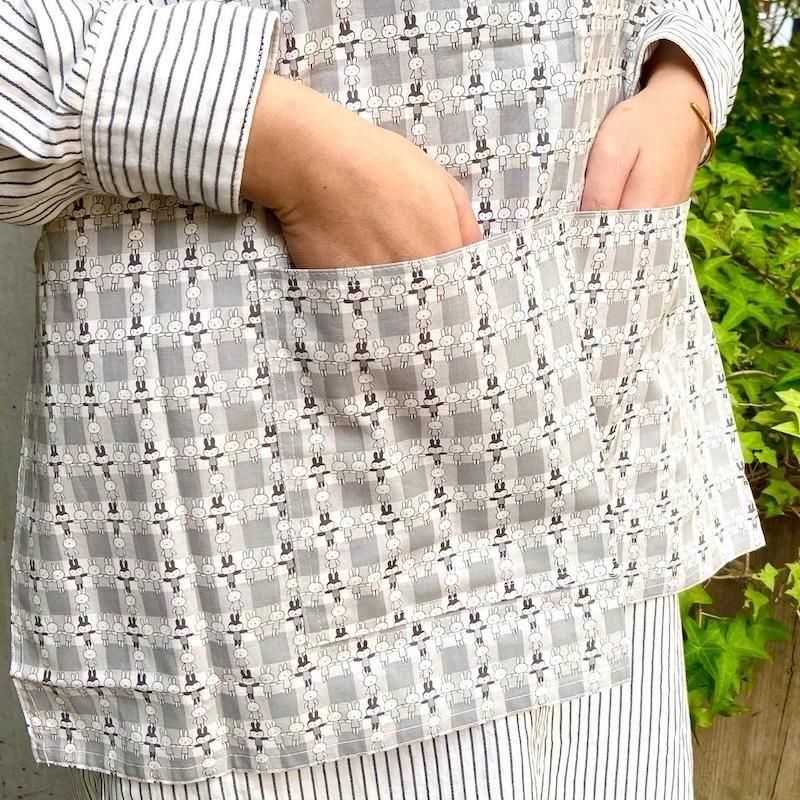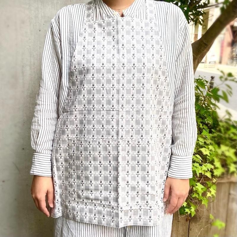 かぶるタイプの短めエプロンなので、脱ぎ着がかんたんですよ