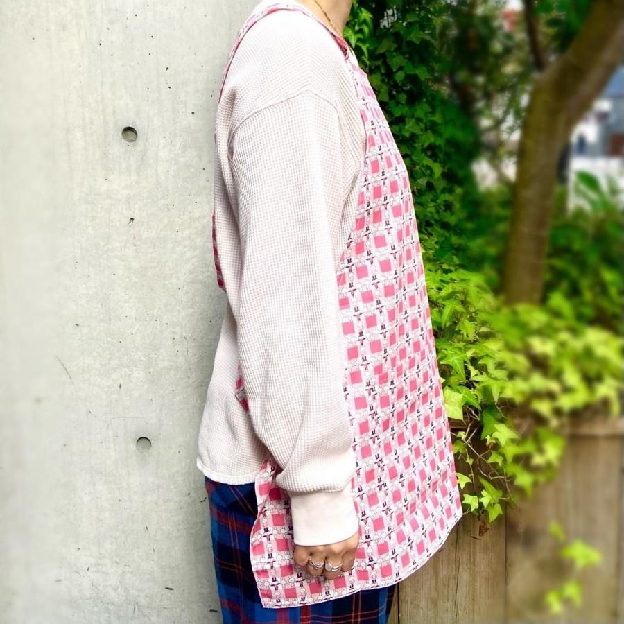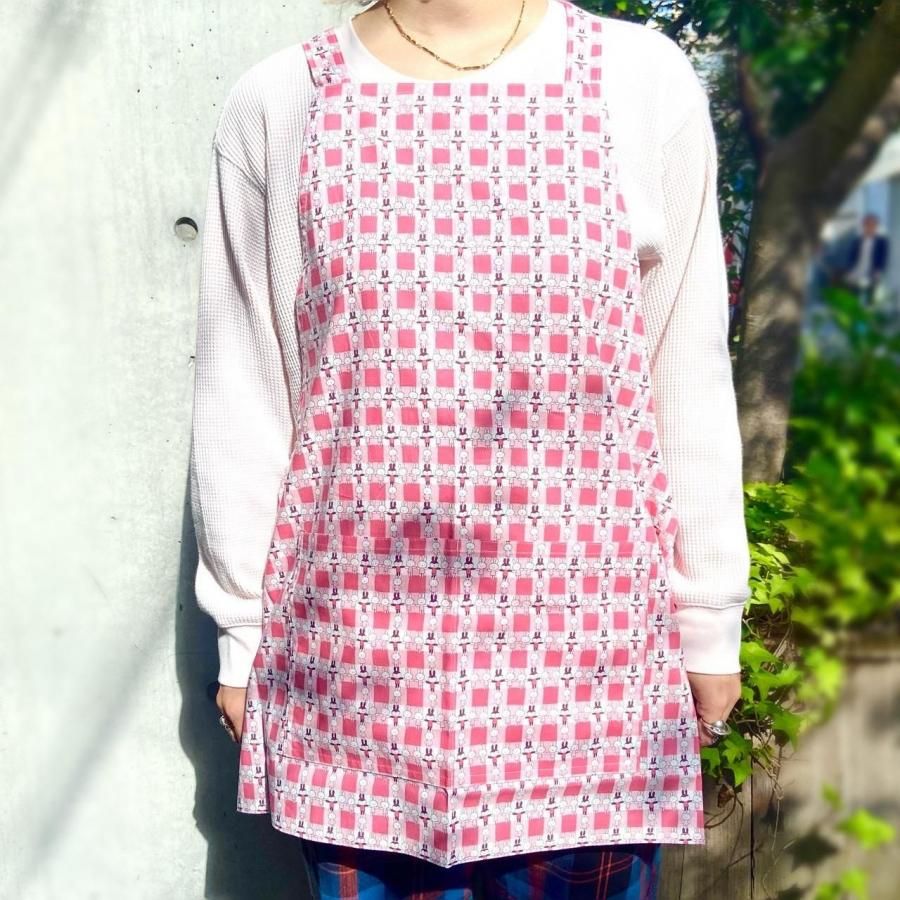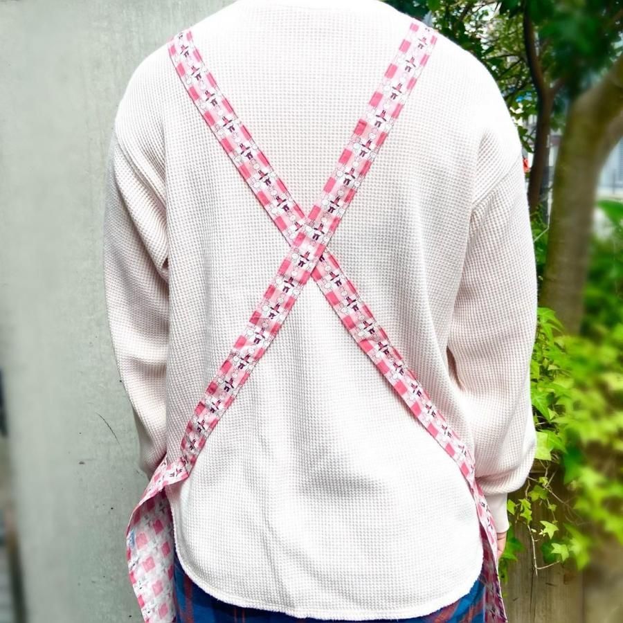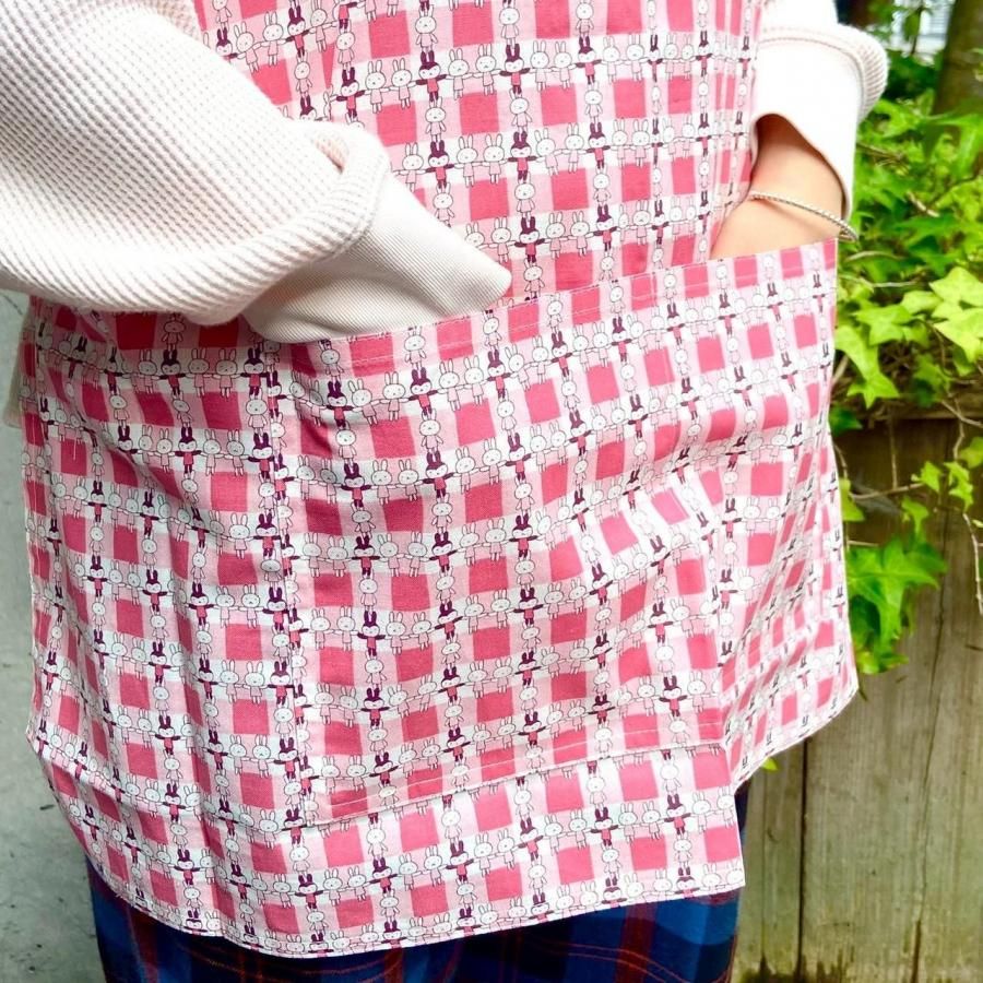 かぶるタイプの短めエプロンなので、脱ぎ着がかんたんですよ