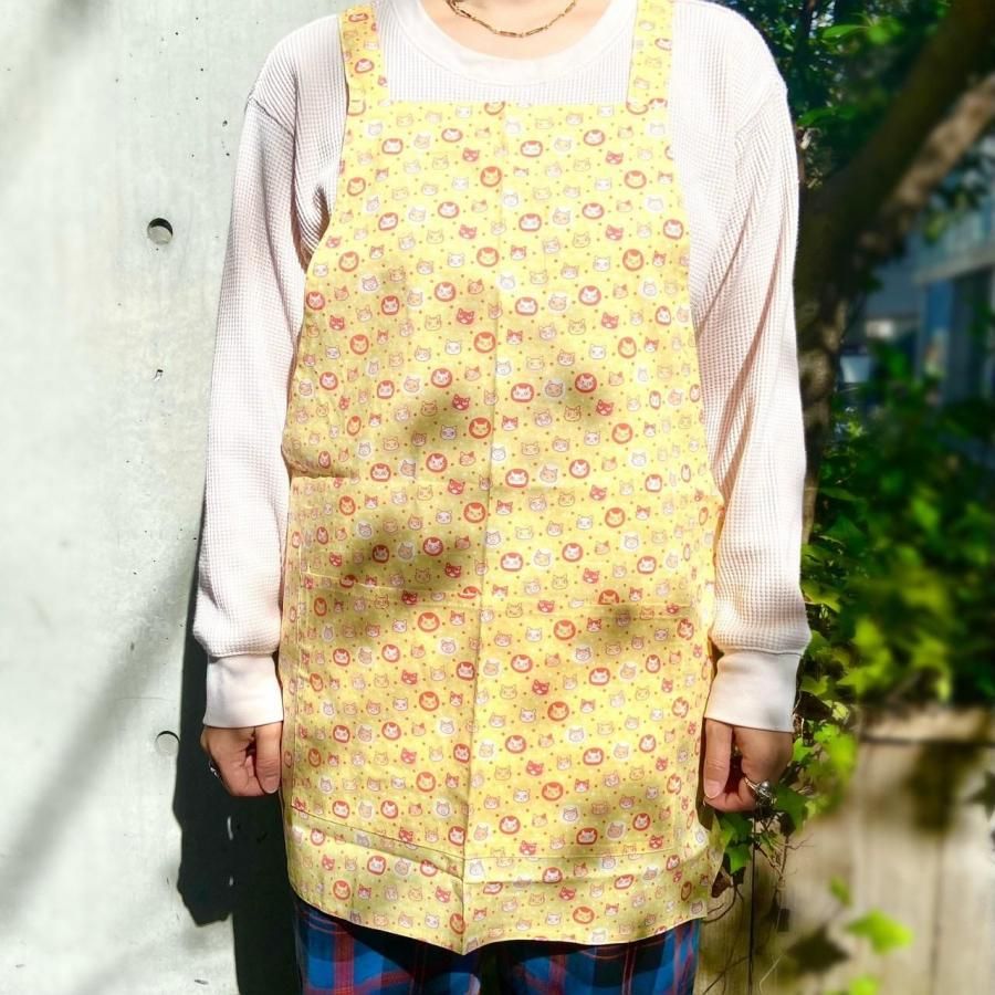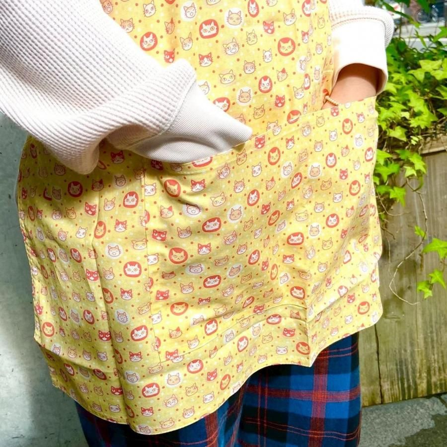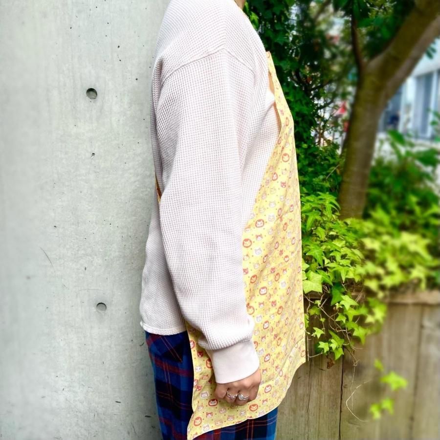 かぶるタイプの短めエプロンなので、脱ぎ着がかんたんですよ