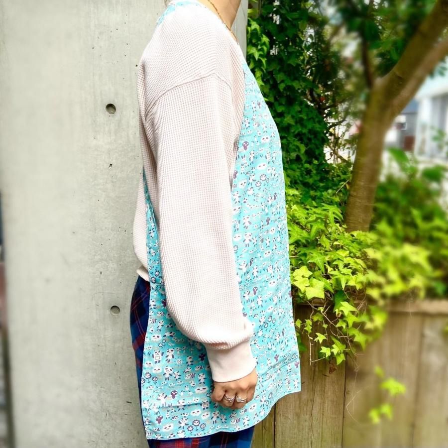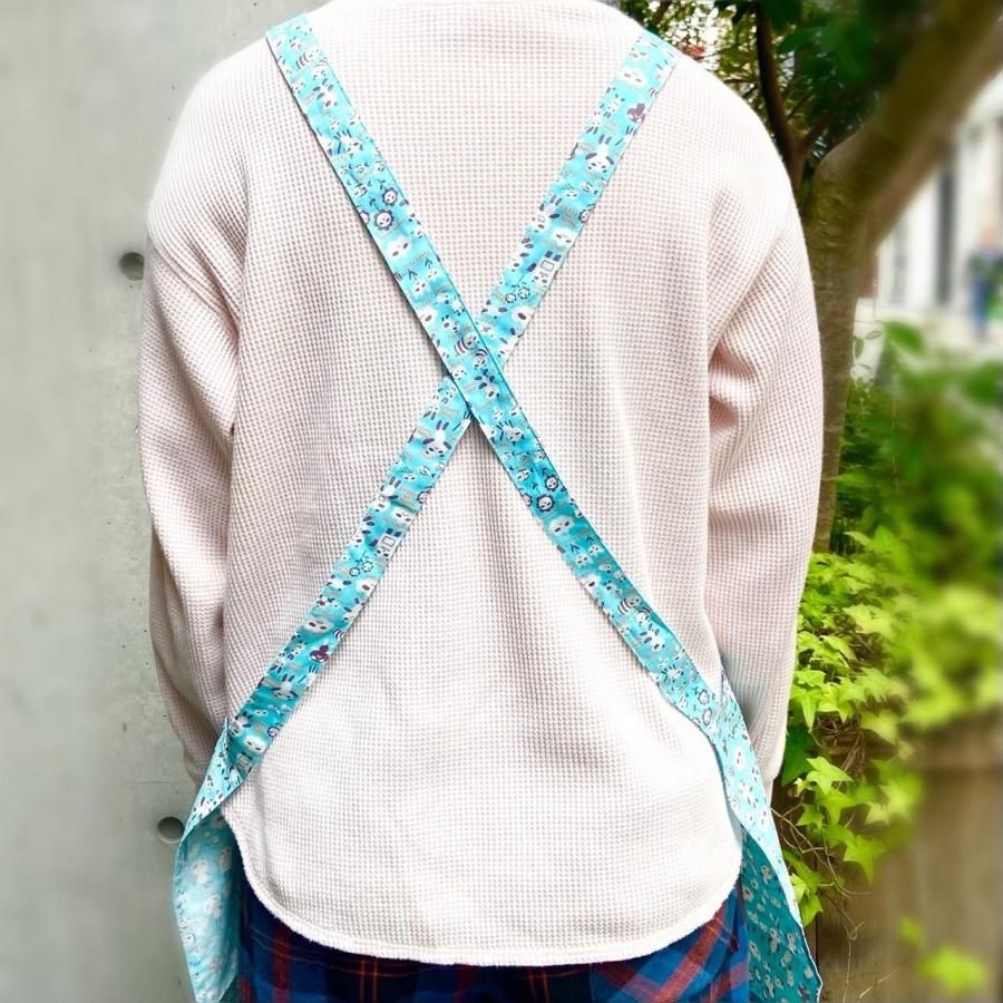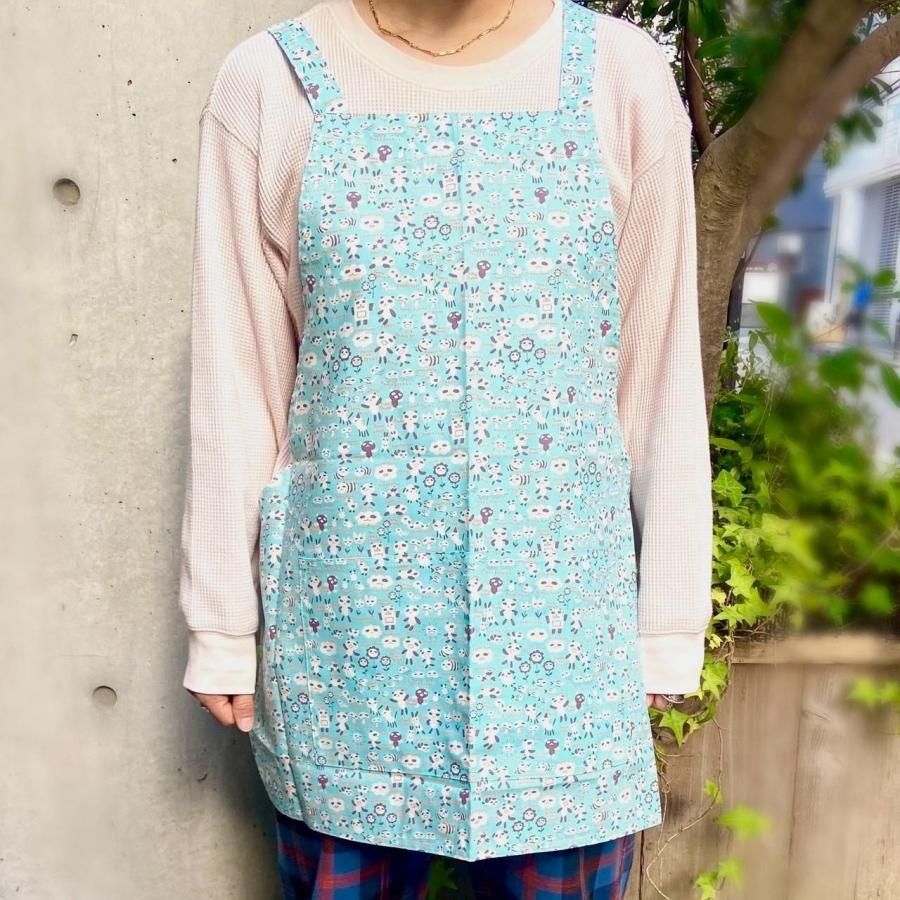 かぶるタイプの短めエプロンなので、脱ぎ着がかんたんですよ