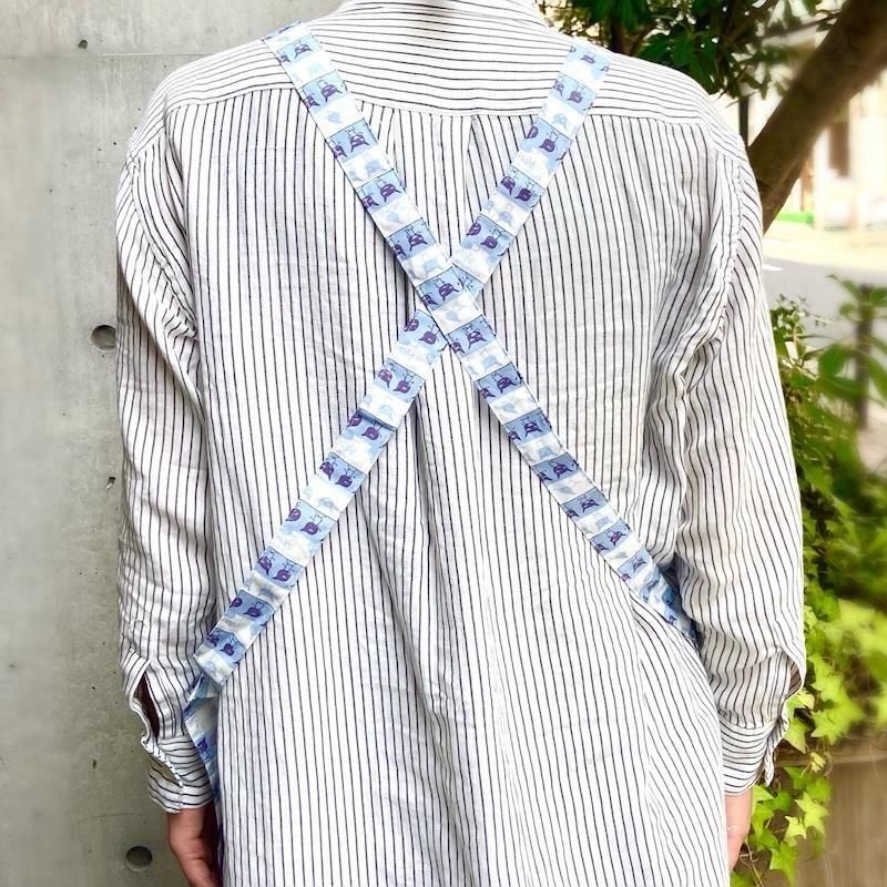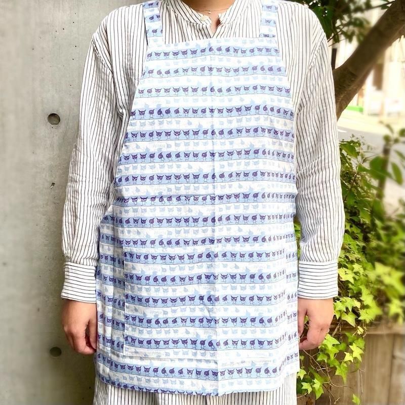 かぶるタイプの短めエプロンなので、脱ぎ着がかんたんですよ