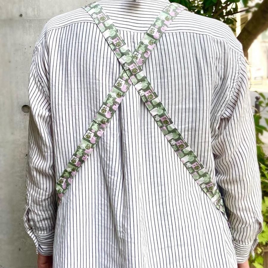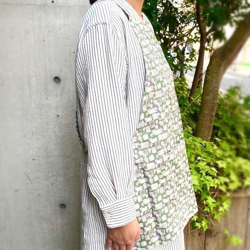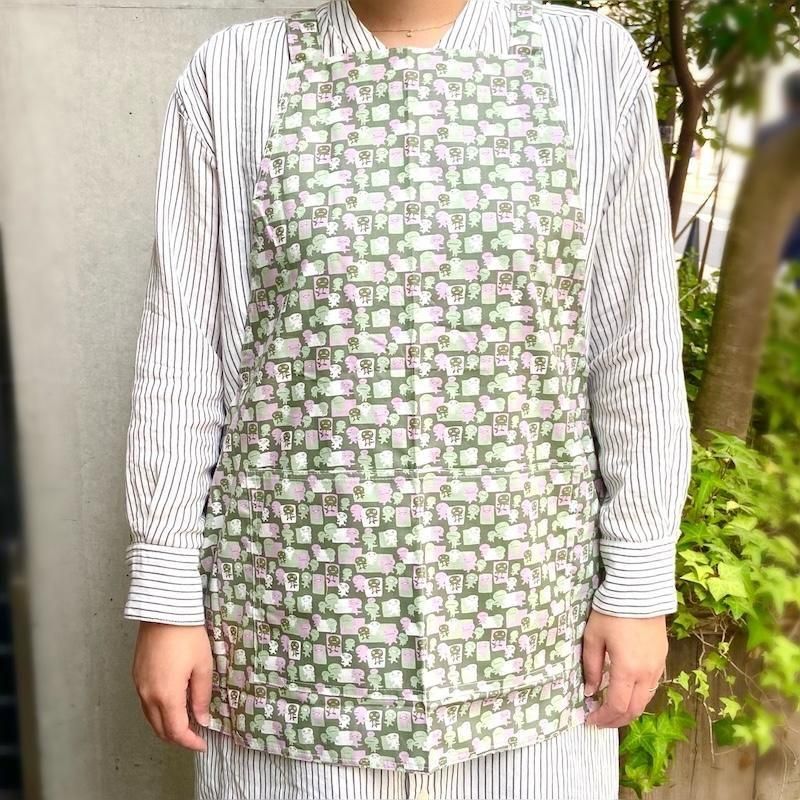かぶるタイプの短めエプロンなので、脱ぎ着がかんたんですよ
